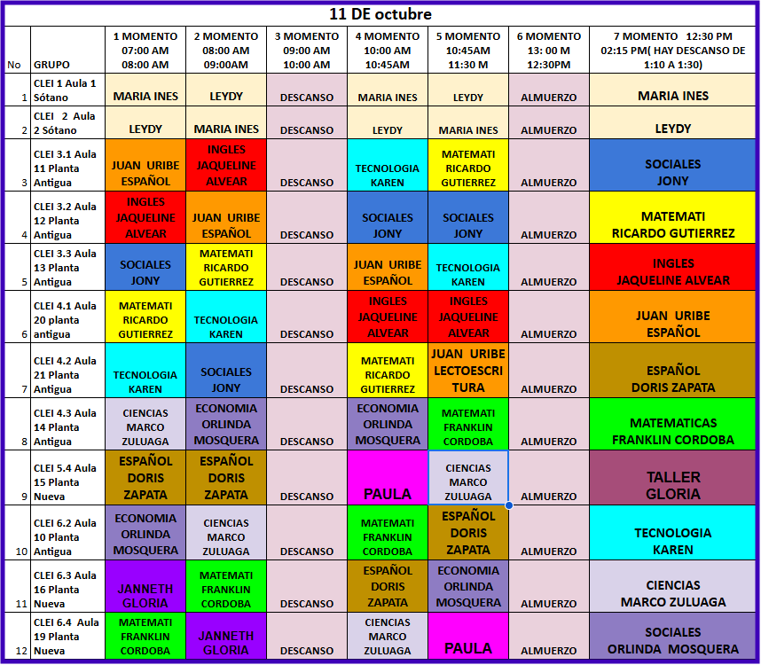 Ingreso 6:45 am se cierra 7:05 en la mañana. Finalización de la jornada a las 2:14pm. Almuerzo 11:30 a 12:30